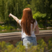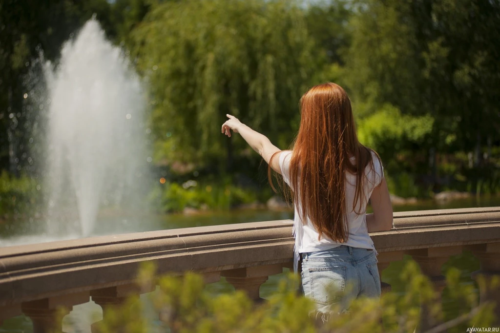 На снимке изображена молодая женщина с длинными рыжими волосами. Она стоит на открытом воздухе возле водоема, возможно фонтана, который распыляет воду на заднем плане. Окружающая среда предполагает, что это может быть парк или сад. Вокруг нее деревья и зелень, и кажется, что это солнечный день.