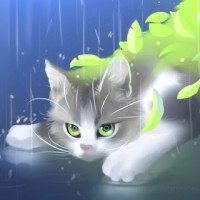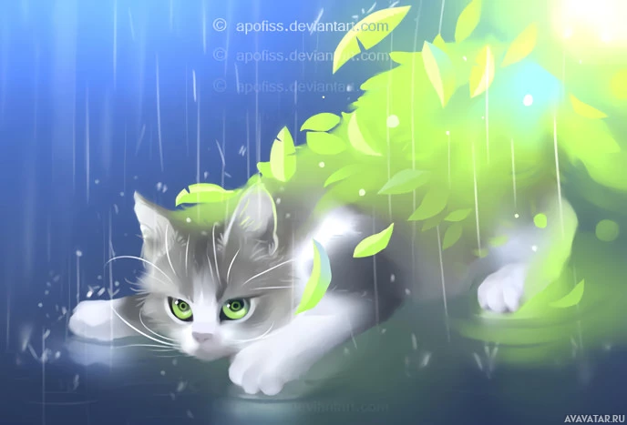 blue background and raindrops visible throughout the scene, giving the impression that it is raining. The cat has