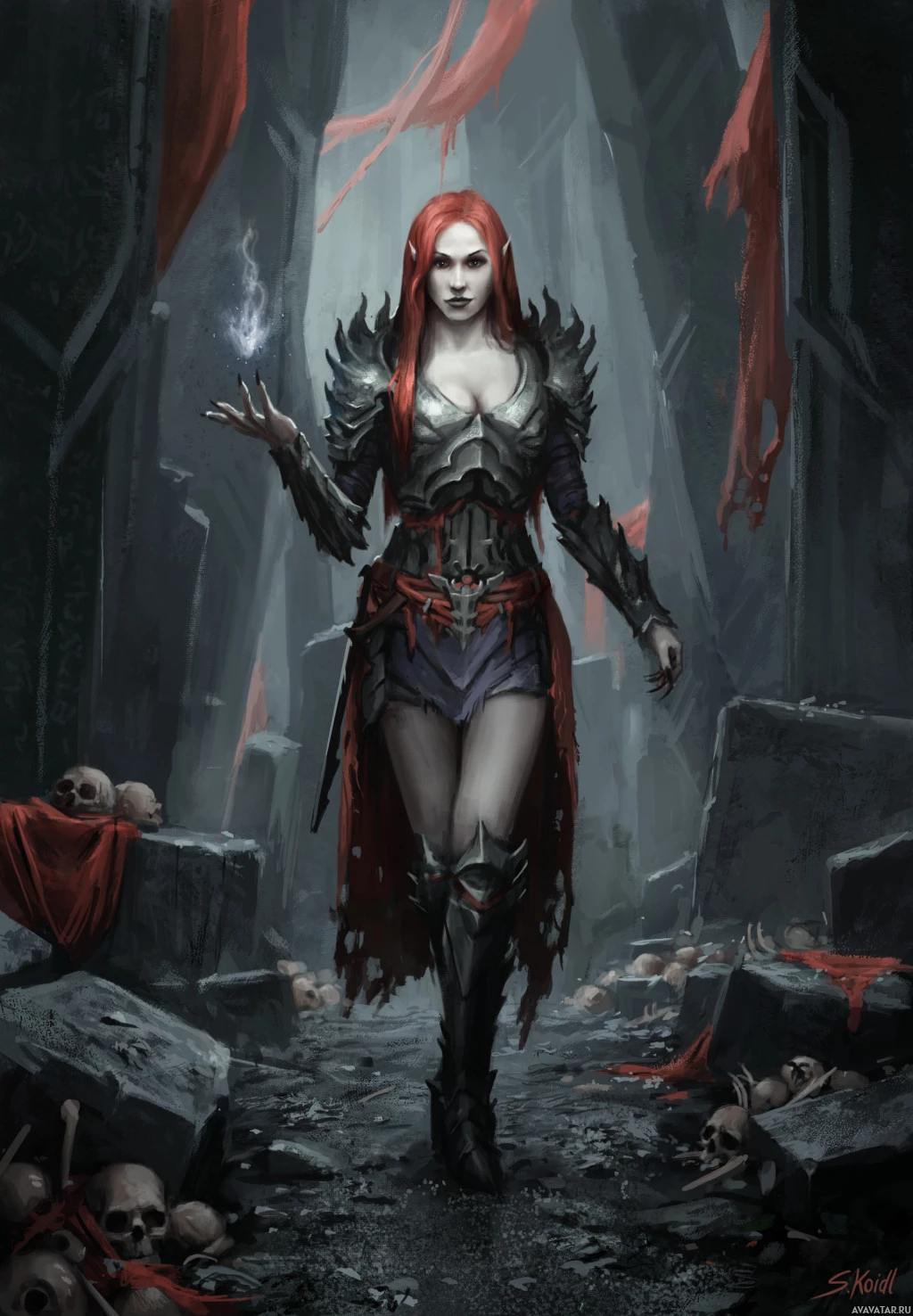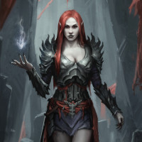 red hair and is wearing armor and a cloak with what appears to be a magical or enchanted quality. The character stands amidst a somewhat