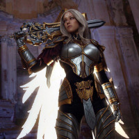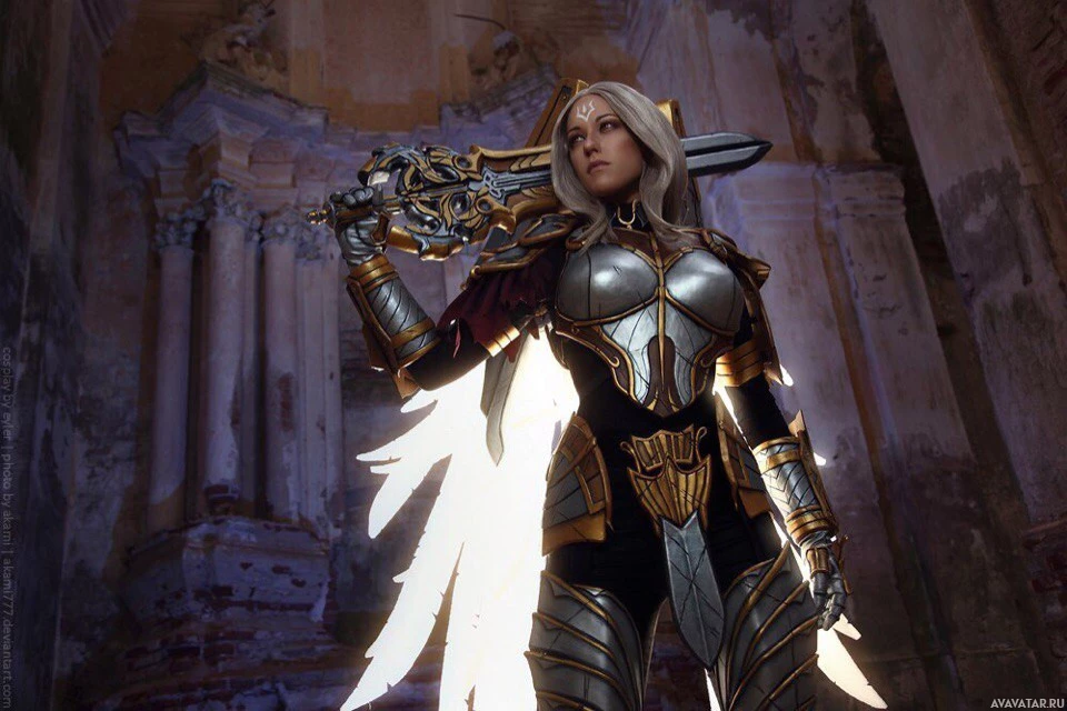 a fantasy setting, possibly inspired by angels. This figure is holding a sword and is adorned with armor that resembles the traditional depiction of an angel, complete with wings and a halo-like headpiece. The background suggests a historical or mythical location, possibly a temple or ruins.