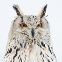 The image shows a snowy owl perched on a branch. It is characterized by its striking appearance, with its white plumage adorned with dark markings and a bright orange eye gazing intently into the distance. This bird belongs to the family of birds known as "Strigidae," which includes various species of owls.