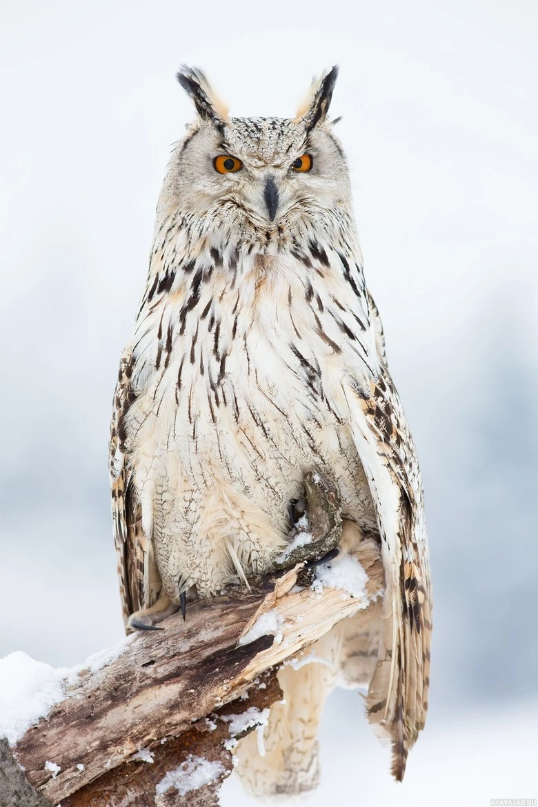 На снимке изображена снежная сова, сидящая на ветке. Он характеризуется своим поразительным внешним видом, с его белым оперением, украшенным темными отметинами и ярко-оранжевым глазом, пристально глядящим вдаль. Эта птица относится к семейству птиц, известных как «Strigidae», в которое входят различные виды сов.