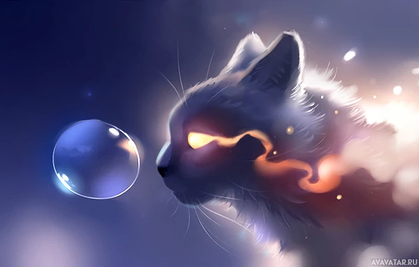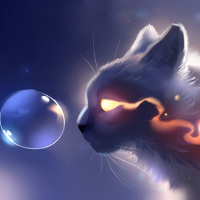 glowing eyes, seemingly floating in the air. The cat's gaze is directed towards a bubble that appears to be melting or bursting near its face. Behind the cat, there are flames and sparkles that add a magical or mystical atmosphere to the scene. The background is dark with hints of stars and