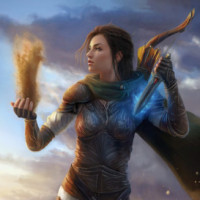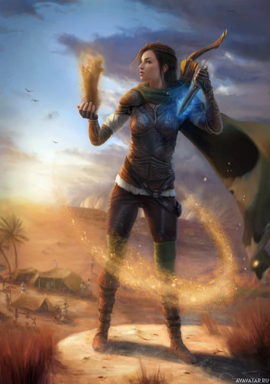 a female character in a fantasy setting. She is depicted as a warrior or adventurer, wearing armor and carrying a bow. In her hand, she holds what appears to be