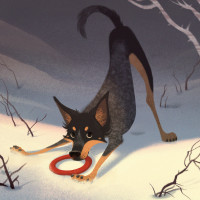 The image shows an animated dog. It appears to be a stylized character rather than a photograph of a real dog. The dog is in the midst of catching a red ring with its mouth, which suggests that it might be engaged in a game or playful activity.