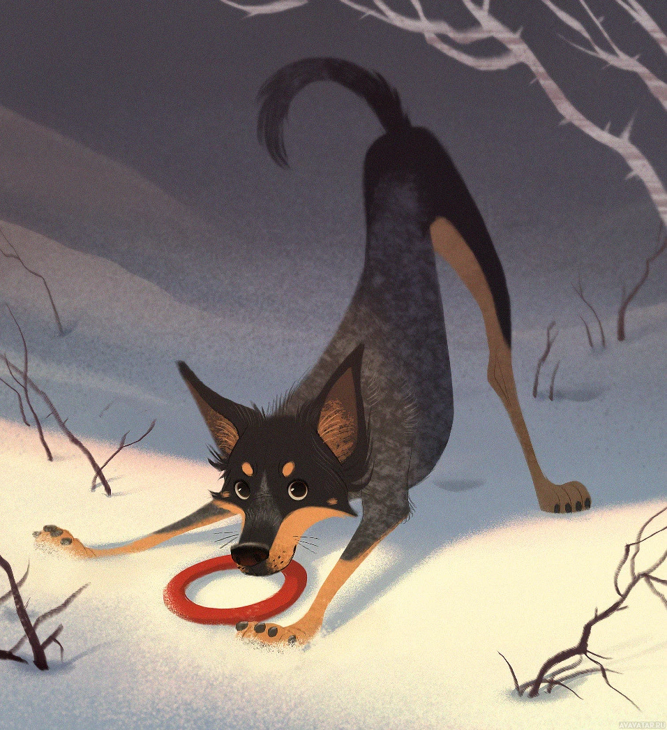 На картинке изображена анимированная собака. Это скорее стилизованный персонаж, чем фотография настоящей собаки. Собака находится в разгаре ловли красного кольца ртом, что говорит о том, что она может заниматься игрой или игривой деятельностью.