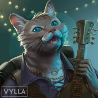 the warm lighting and string lights hanging from the ceiling. The cat is stylized in an anthropomorphic manner, giving it human characteristics such as