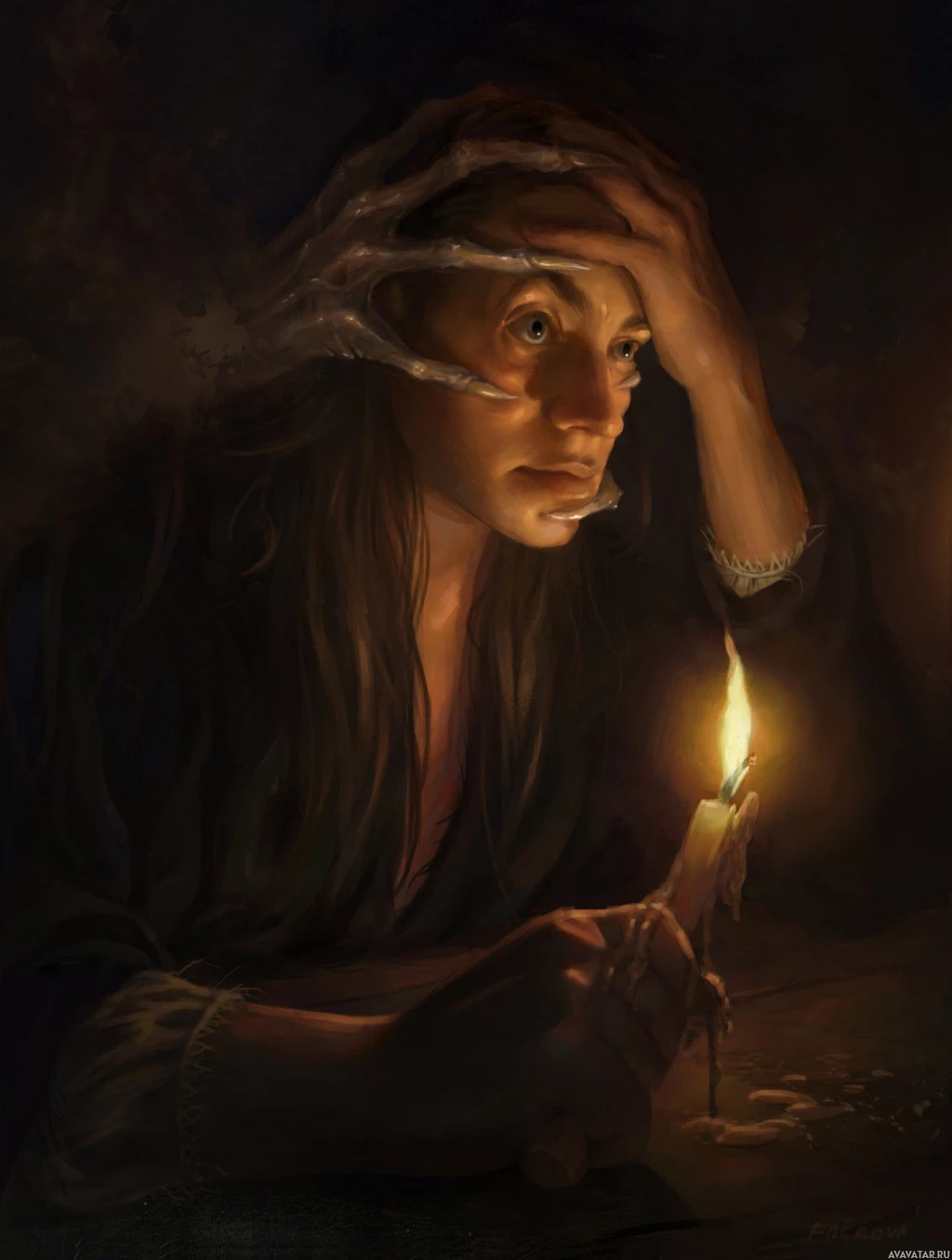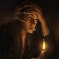 The image depicts a person with their hands on the sides of their head, possibly in distress or contemplation. They are looking down at what appears to be a candle placed on a surface before them. The setting has a dark, gothic feel, with an oil lamp providing