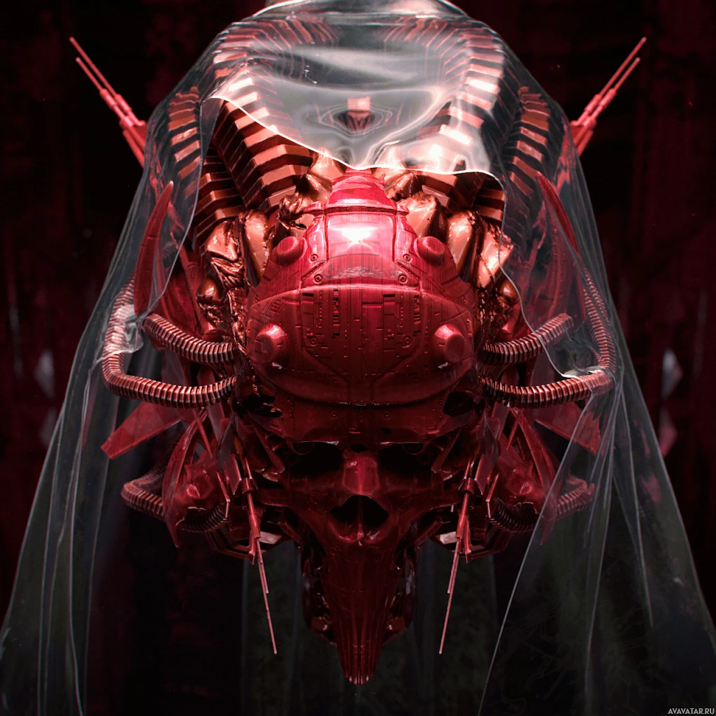 На картинке изображена голова, заключенная в красную механическую оболочку или структуру с несколькими элементами, которые напоминают черепа. Это создает сложный и сложный дизайн, который объединяет органические человеческие особенности с механическими компонентами. Фон темный и имеет готический или промышленный оттенок, способствующий жуткой атмосфере изображения.
