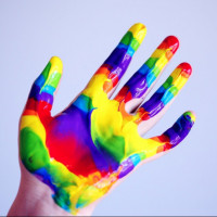 paint splatter pattern on the palm and fingers. This is commonly associated with an activity known as painting or creating art, where