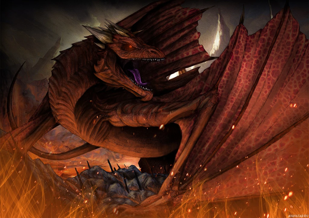 a powerful dragon, which appears to be Smaug from J.R.R. Tolkien's Middle-earth mythology. It is shown in a fierce or majestic posture, surrounded by flames, suggesting it might be in the midst of destroying something with its
