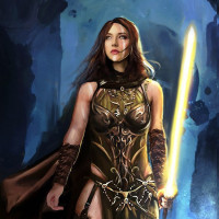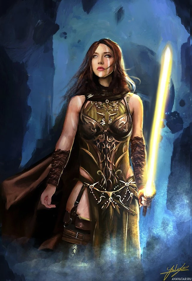 The image depicts a female character in a fantasy setting. She is wearing armor and holding a sword, suggesting she might be a warrior or a character from a fictional story. The background has an ethereal quality with blue tones, which adds to the otherworldly feel of the scene.