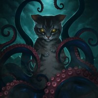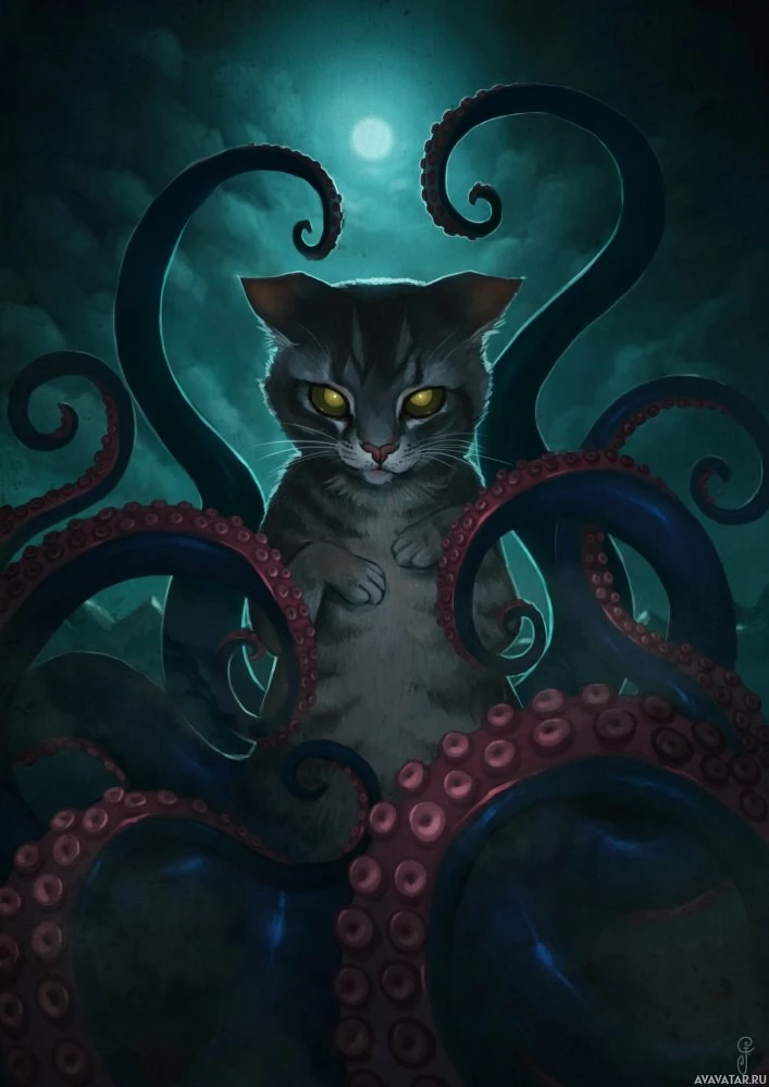 a fantastical scene featuring a cat sitting in front of an octopus. The cat has a somewhat anthropomorphic expression, with its paws crossed and