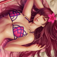 The image depicts an animated female character. She has red hair, is wearing a bikini with pink details, and there's a flower on her head. She appears to be lounging on sand or a beach setting.