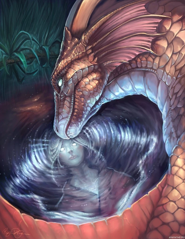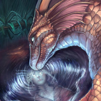 a fantasy scene featuring a dragon. The dragon has its head resting on