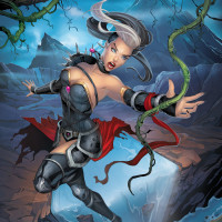 short hair, is wearing armor, and is holding what appears to be a staff or wand. The setting suggests a dark or mystical environment with elements like moss or vines, possibly indicating a magical or enchanted forest. The artwork style is typical of high-quality fantasy illustrations that are often used in games, books, or other media.