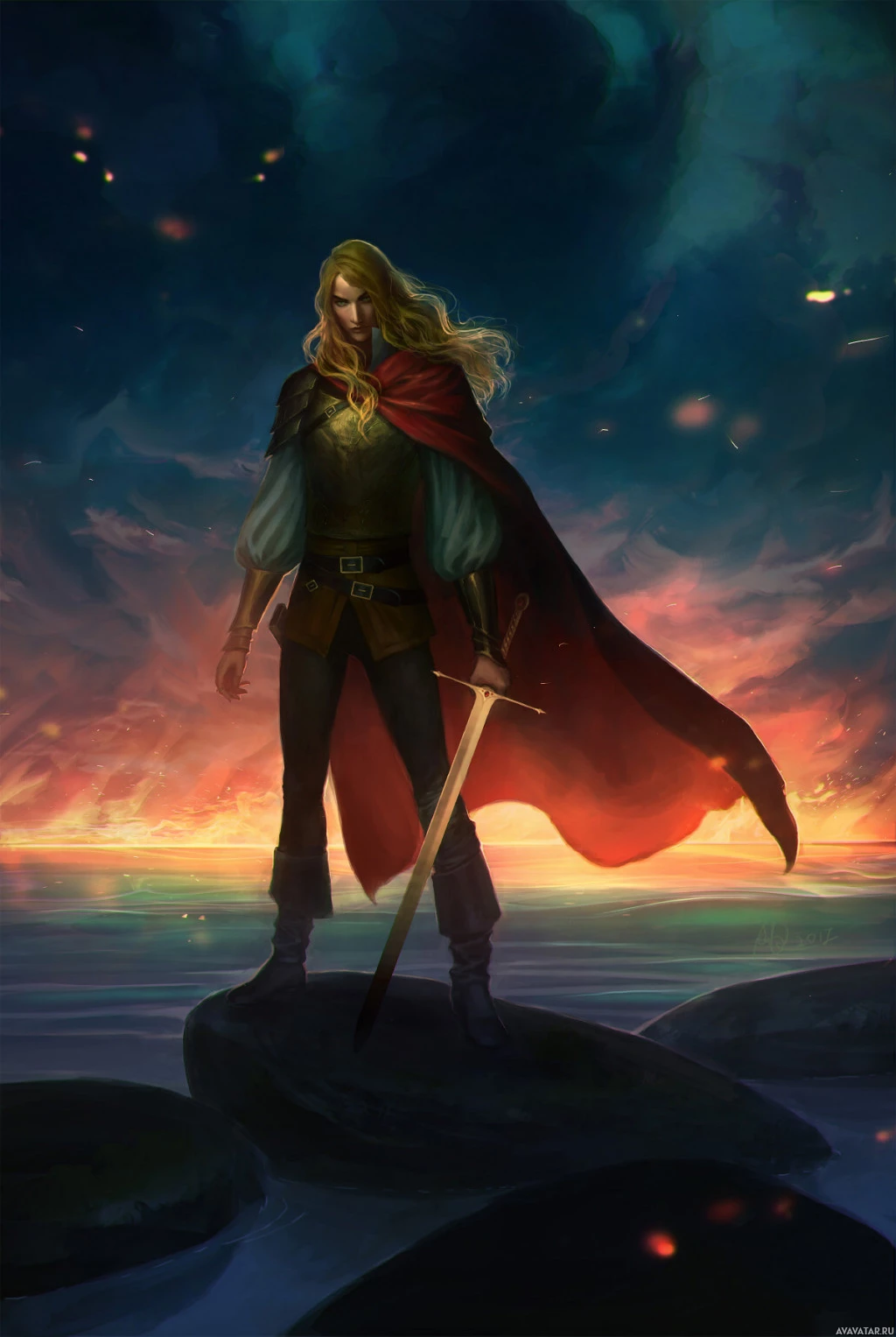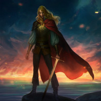 a body of water with a backdrop of dramatic clouds and possibly a setting or rising sun. They are wearing armor and carrying a sword, suggesting they might be a warrior or defender within their narrative context. The cloak adds to