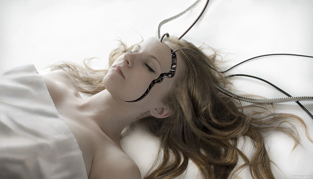 На картинке изображена молодая женщина, лежащая в постели с закрытыми глазами. На ее голове есть роботизированные или технологические компоненты, которые напоминают механические части и провода, что говорит о продвинутой технологической теме. В представленном контексте нет видимой «девушки» или «робота».