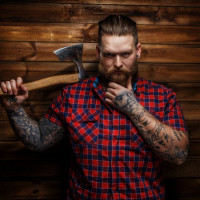 На картинке изображен мужчина с татуировками на руках и лице. Он носит клетчатую рубашку и бороду. Он держит топор в одной руке и направляет его к подбородку, как будто собирается ударить себя им. Фон выглядит как деревянная стена, что говорит о том, что фотография могла быть сделана в деревенской или наружной обстановке.