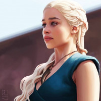 The image features a character from the television series "Game of Thrones" named Daenerys Targaryen. She is portrayed by actress Emilia Clarke and has become known for her role in the show, particularly in later seasons where she played an important part in the narrative.