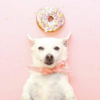 a small dog sitting upright, looking directly at the camera with its mouth slightly open as if smiling. Above the dog's head is a donut with sprinkles on it, and there are additional sprinkles scattered around the dog's