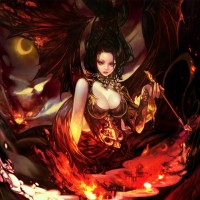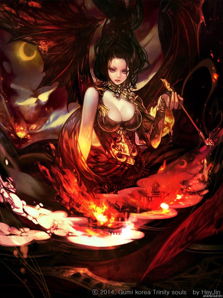 fantasy art. The background features fiery elements and a red-skinned creature that resembles a devil or another form of