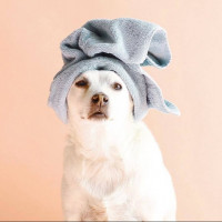 The picture shows a small dog wearing a white towel on its head, similar to how a person might wear a hair wrap or turban. The dog appears to be seated and is looking at the camera with an inquisitive expression.