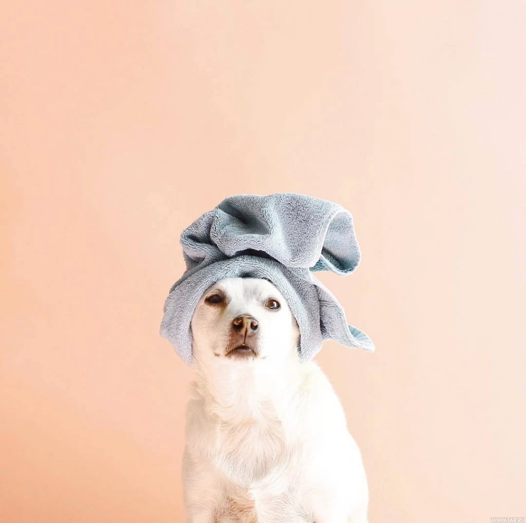 На снимке изображена маленькая собака с белым полотенцем на голове, похожая на то, как человек может носить обертку для волос или тюрбан. Собака сидит и смотрит на камеру с любознательным выражением.