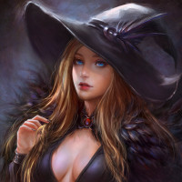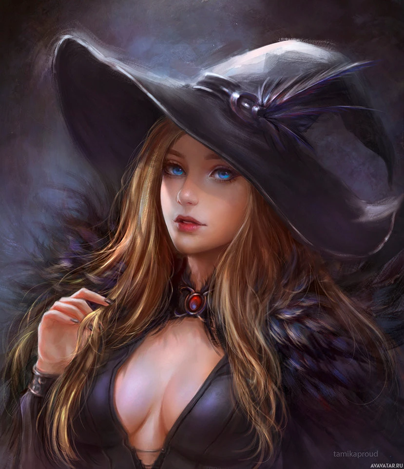 black hat adorned with feathers, suggesting a mystical or magical theme. Her outfit includes a bodice that appears to be made of