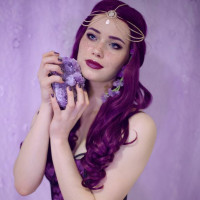 a small rock or crystal in her hand. The background is purple, which complements her color scheme. The woman appears to be posing for the photo, showcasing a fantasy-like attire that includes a headpiece with gems. Her makeup and clothing are coordinated with the theme of her hair and eye accents.