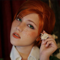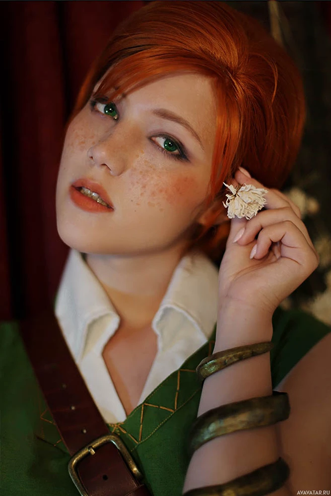 a cosplay outfit resembling Shani from the game "The Witcher." They are wearing a costume with elements of