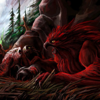 art piece depicting a fantasy-themed scene. In the image, there are several griffons, which are