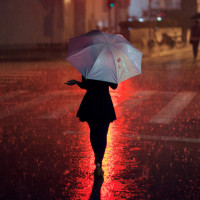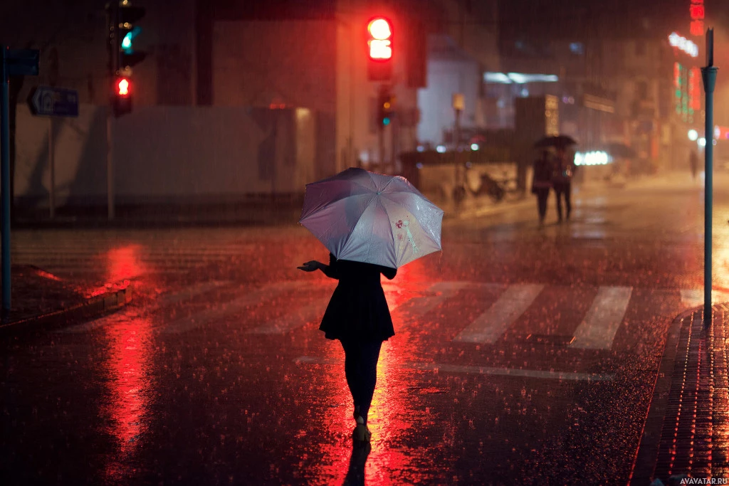 На снимке изображен силуэт девушки, идущей с зонтиком под дождем. Она носит белый зонтик и, кажется, переходит улицу. Сцена запечатлена ночью, о чем свидетельствуют красные светофоры и влажная, отражающая поверхность улицы. На тротуаре видны другие люди, что говорит о том, что это может быть оживленная зона даже во время дождя.