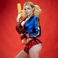 blonde hair styled similarly to Harley Quinn's classic appearance. The person is holding