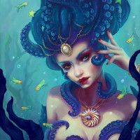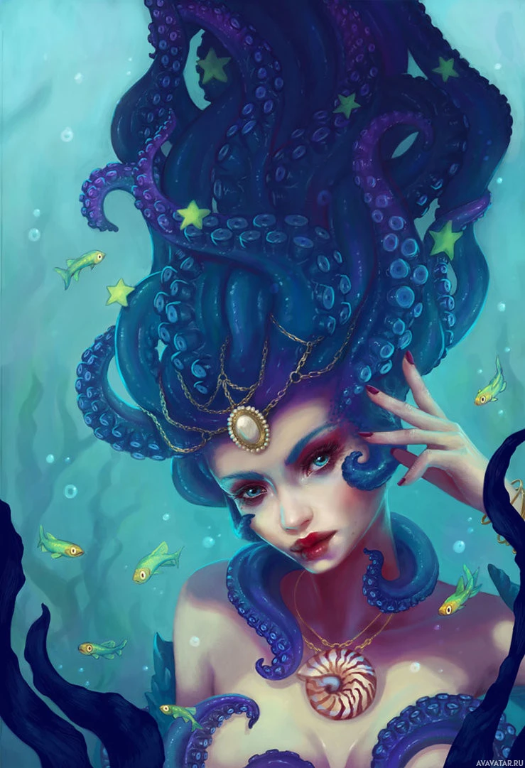 mythological creature. The character has long flowing hair that mimics the appearance of octopus tentacles, enhancing her