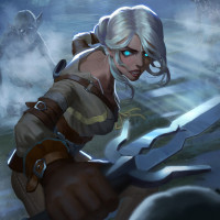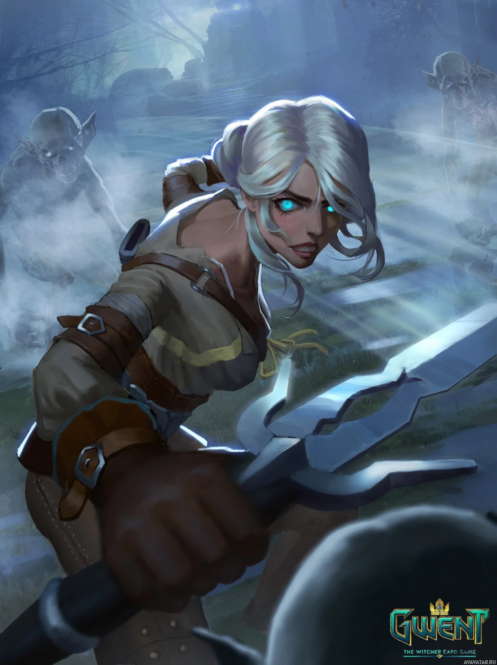 the video game "The Witcher" series, as indicated by the logo in the bottom right corner. Her expression is intense and focused, which adds to the overall dynamic of the scene.