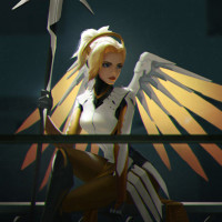 the video game Overwatch. The character is Mercy, a healer and support hero known for her