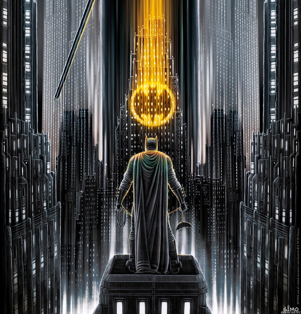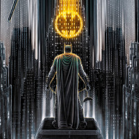Gotham City from the Batman comics and movies. There are also elements such as a ring or perhaps a portal above his head and what seems to be a digital or cybernetic design in the background, which could imply