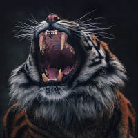 На картинке изображен тигр, который является животным. Тигр, кажется, показывает зубы и громко ревет, захватывая момент грубой эмоции или интенсивности. Он стоит на более темном фоне, который контрастирует с яркими цветами меха тигра.