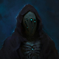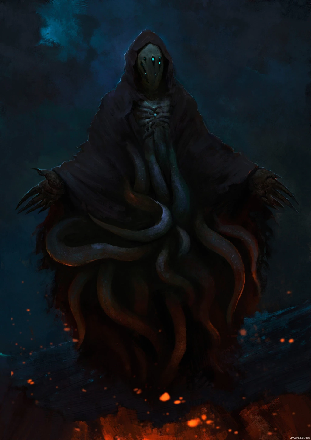 The image depicts a fantasy-themed character that resembles a wizard or sorcerer. This creature has tentacles and is wearing a cloak, which gives it an eerie appearance. It's set against