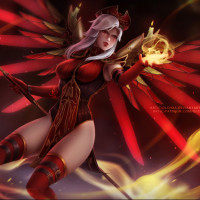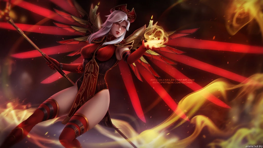 На картинке изображен персонаж из игры Overwatch. Она - Мерси, герой поддержки целителей, известный своими крыльями, которые позволяют ей летать и ее способность исцелять союзников. На ней красные и золотые доспехи, представляющие ее происхождение как ангела. В этой позе она кажется мощной и готовой к действию.