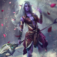 white hair, pointed ears, and is wearing armor with intricate designs, suggesting she may have a high status or role within her society. The background features