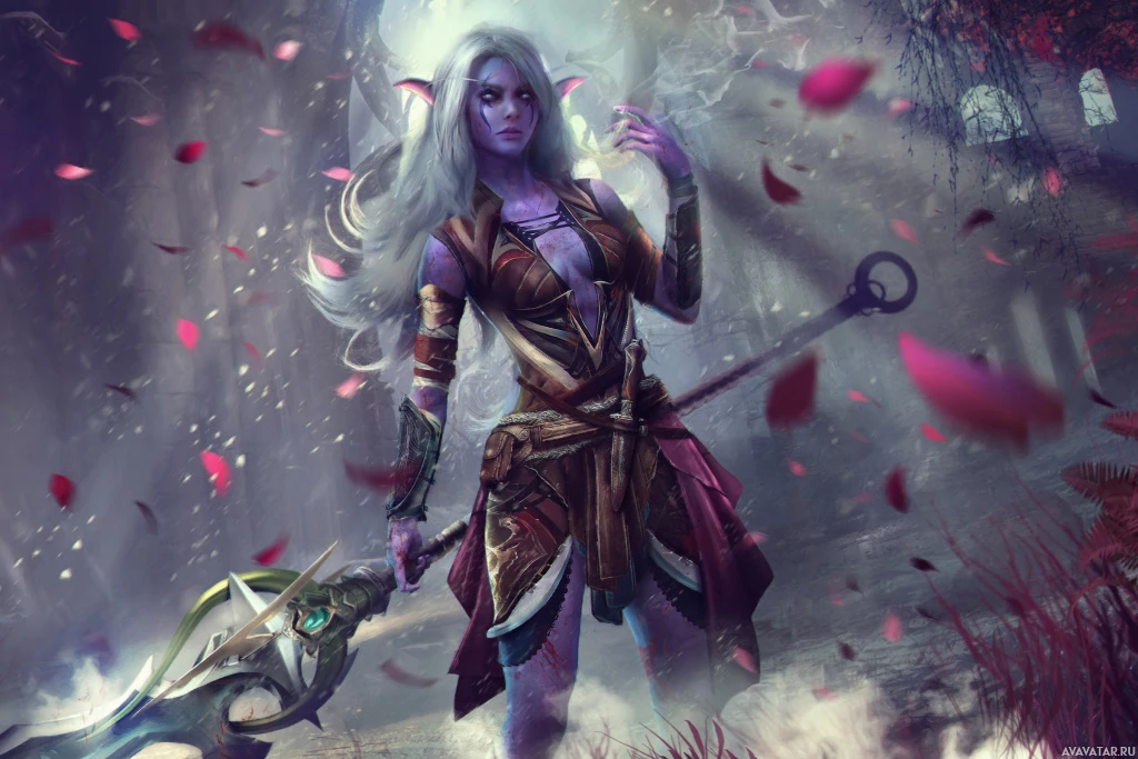 pink flowers scattered on the ground and a mystical ambiance, enhancing the fantasy theme of the artwork.