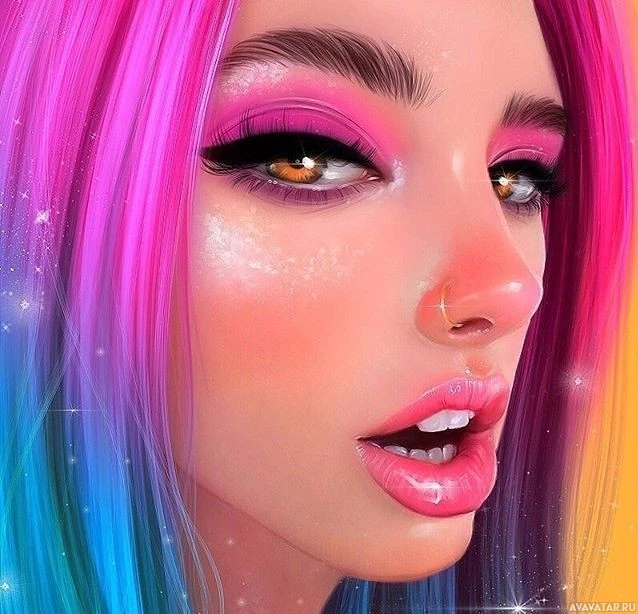 eye shadow. She has a nose piercing and is wearing lipstick. There are sparkles around her head, suggesting an ethereal or magical theme. The color palette of the image is bright and lively, with
