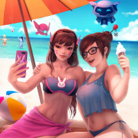 animated characters, likely from the Overwatch franchise, enjoying a day at the beach. They are dressed in swimwear and sitting on a towel with