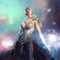 golden armor that suggests a regal status. The background consists of cosmic elements like stars, planets, and nebulae, which creates
