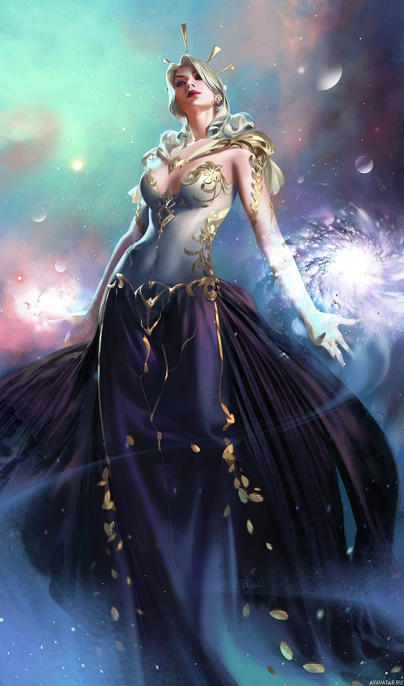 The image depicts a fantasy-themed illustration of a girl. She has an ethereal and celestial appearance, with features such as