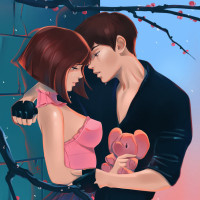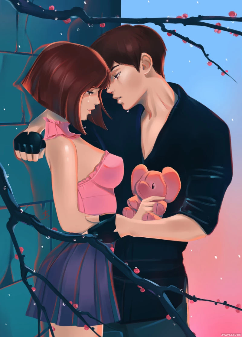 close proximity, with his arm wrapped around her waist, indicating affection towards her. He has brown hair and is wearing a black vest over a white top. Both characters are looking at each other, adding to the emotional connection implied by their poses. The background suggests a scene from a story or animation, possibly set during twilight or evening, given the soft lighting and the hint of cherry blossoms, which could suggest a romantic setting.