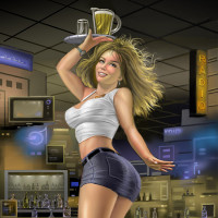 a bar scene: there are tables and chairs where patrons are sitting, drinks on the tables, bottles behind the bar, and signs indicating various types of beverages available. The overall ambiance suggests a nightclub or similar adult