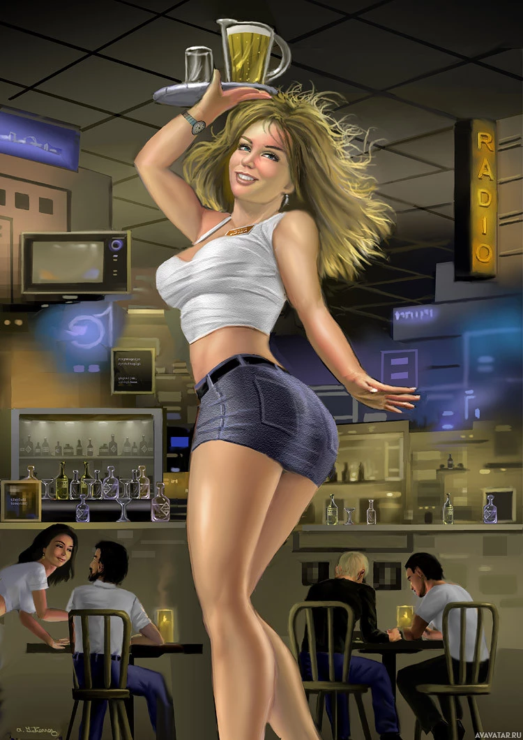 a woman in the center who appears to be dancing or performing, holding what looks like a drink in one hand and her hip with the other. She has blond hair and is wearing